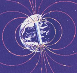 Notes: Field lines of a bar magnet are commonly illustrated by iron filings sprinkled on a sheet of paper held over a magnet. Similarly, field lines of the Earth start near the south pole of the Earth, curve around in space and converge again near the north pole. However, in the Earth's magnetosphere, currents also flow through space and modify this pattern: on the side facing the Sun, field lines are compressed earthward, while on the night side they are pulled out into a very long "tail," like that of a comet. Near Earth, however, the lines remain very close to the "dipole pattern" of a bar magnet, so named because of its two poles. |