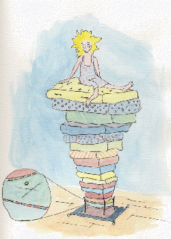 If he wanted her to sleep in this drafty castle, she required a comfortable bed, not one padded with rocks. They ground against her spine, her hipbone when she turned on her side. Soon the mattresses elevated her almost to the ceiling, but still she tossed and turned. Was this misery all he could offer? But, ah, the relief when she'd uttered her last delicious complaint. Then he knew who she was, divined her quality. But the foulness of the insipid peas, mashed, shriveled to a pulp. Yes, she would appreciate soup for lunch, a thick potage, steaming hot, carrot sticks on the side. Claire Keyes Claire Keyes (ckeyes@erols.com) discovered her connection with "The Princess and the Pea" tale during a recent camping trip (at least the Princess had a mattress!). Her blue collar roots reasserted themselves, however, and she henceforth disdains Princess-hood.